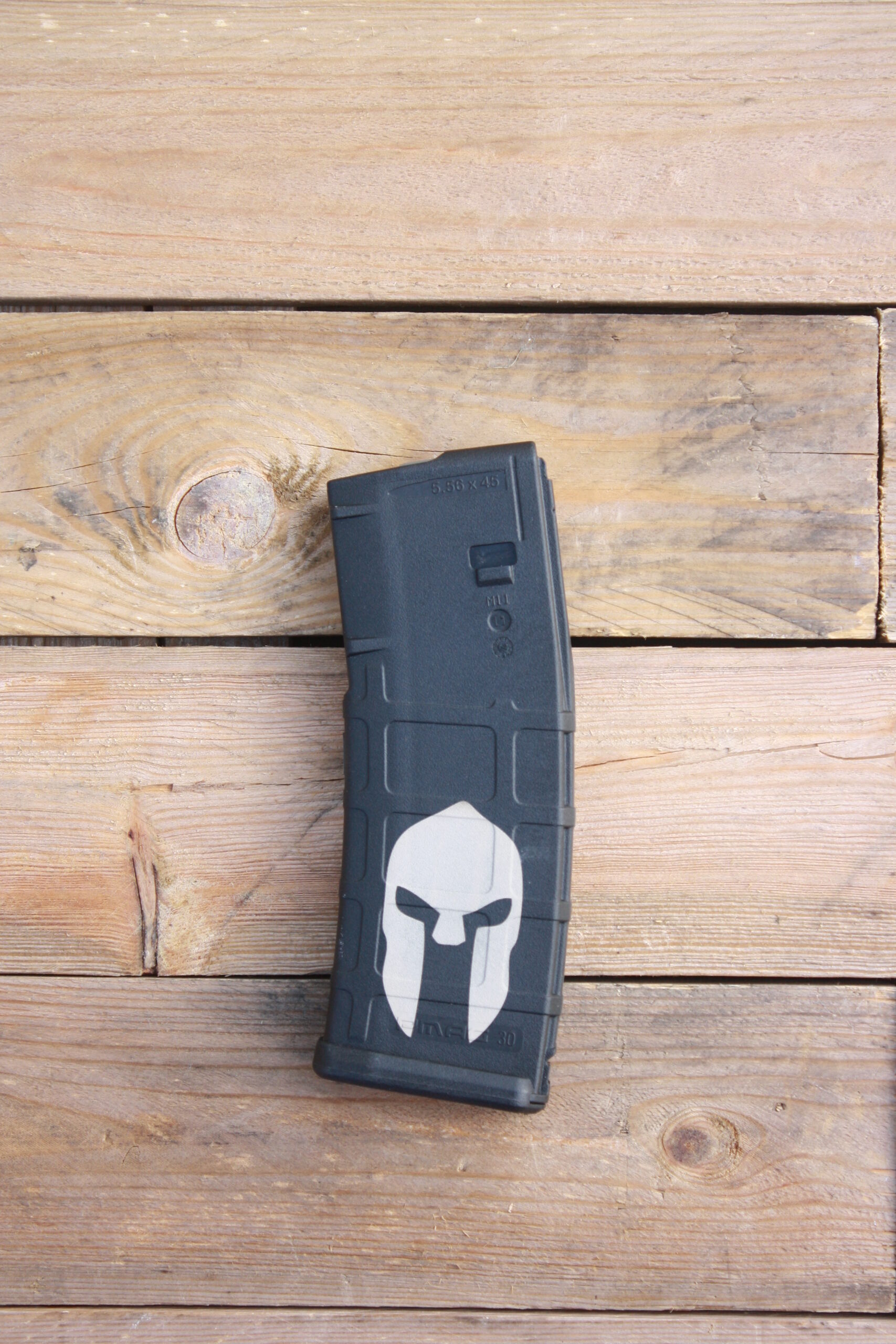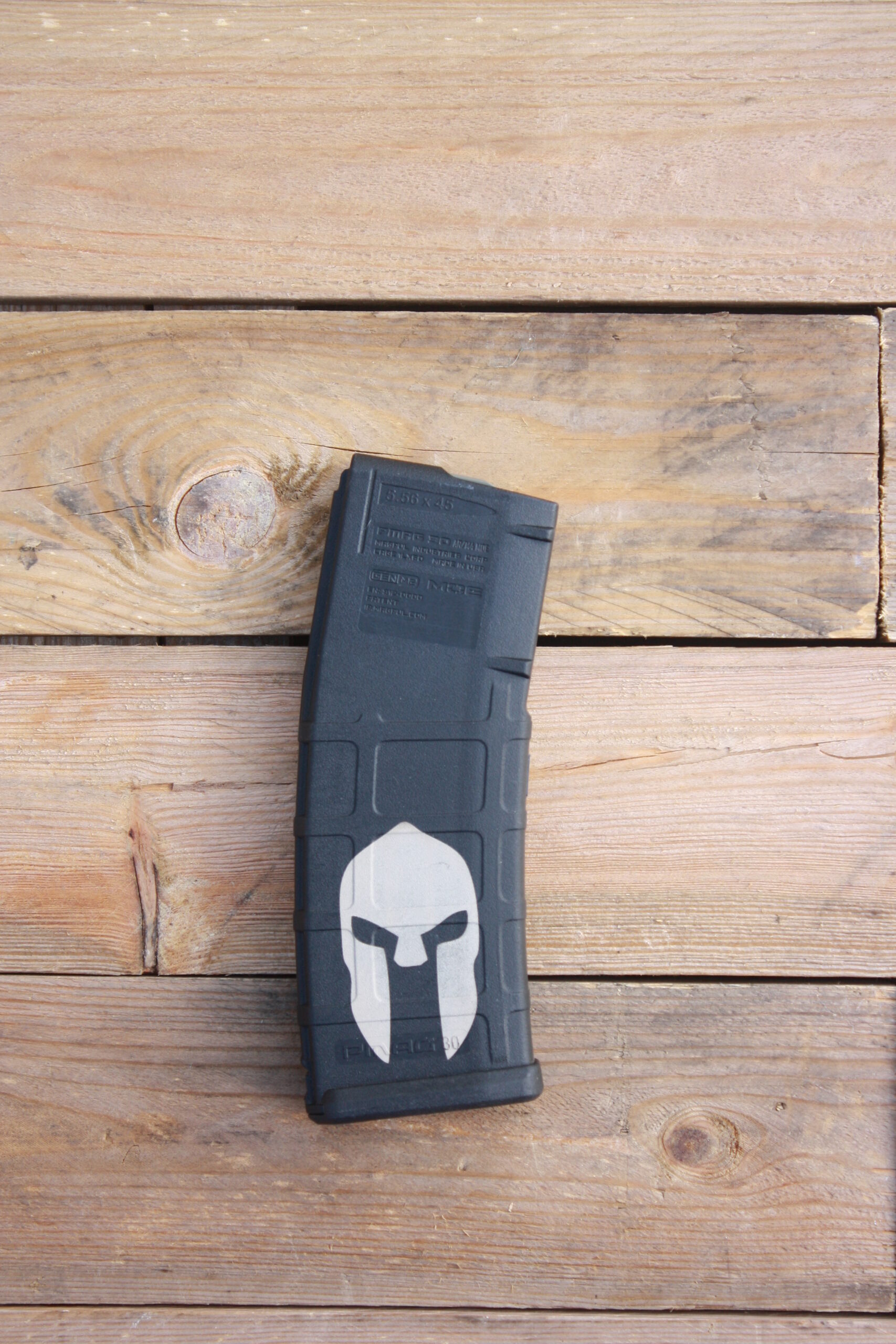 This magazine has been laser etched with the Spartan helmet on both sides of the magazine.